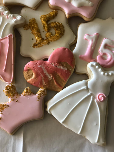 A beautiful set to celebrate your Quinceañera. Price for 1 dozen includes edible metallic details (gold or silver) and individual wrapping.