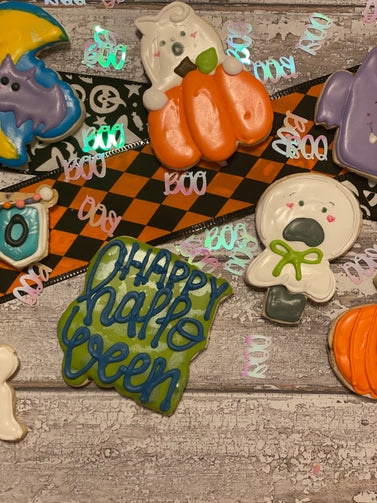 A set of 12 decorated cookies for Halloween.