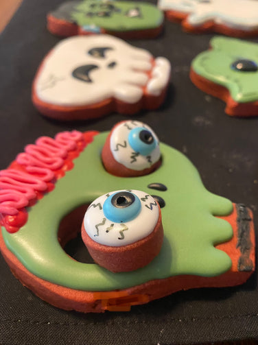 designs as follows: vampire, boogieman, ghost, skull, zombie (with eyeballs) and Frankie
