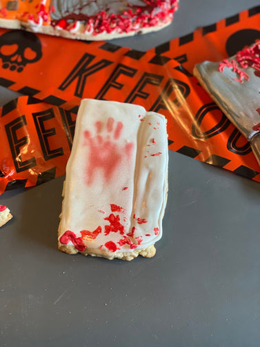 4 large (4 1/2 to 6 inches) cookies hand drawn, hand designed and blooded up by me. Each cookie is iced, sprayed with silvery sheen and decorated with bloody royal icing and a special corn syrup red goo (that dries to the touch)